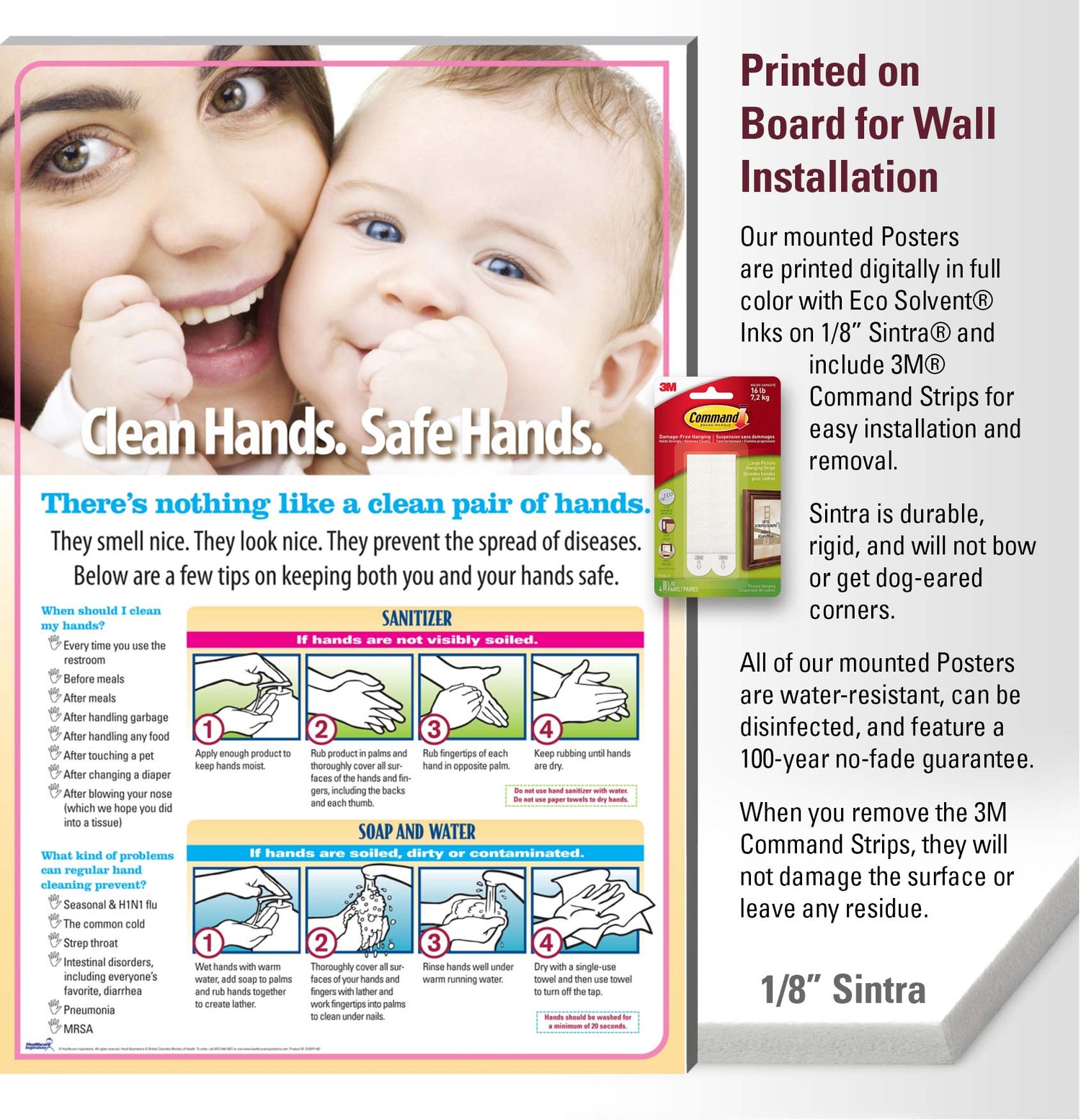 Posters are printed digitally in full color with Eco Solvent® Inks on 1/8” Sintra® and include 3M® Command Strips for easy installation and removal.  Sintra is durable, rigid, and will not bow or get dog-eared corners. Posters are water-resistant, can be disinfected, and feature a 100-year no-fade guarantee. When you remove the posters, they will not damage the surface or leave any residue.