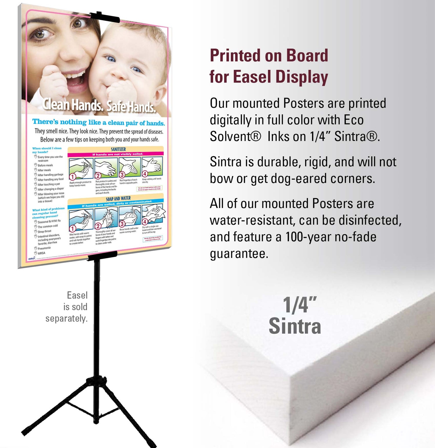Posters are printed digitally in full color with Eco Solvent® Inks on 1/4” Sintra®. Sintra is durable, rigid, and will not bow or get dog-eared corners. Posters are water-resistant, can be disinfected, and feature a 100-year no-fade guarantee.