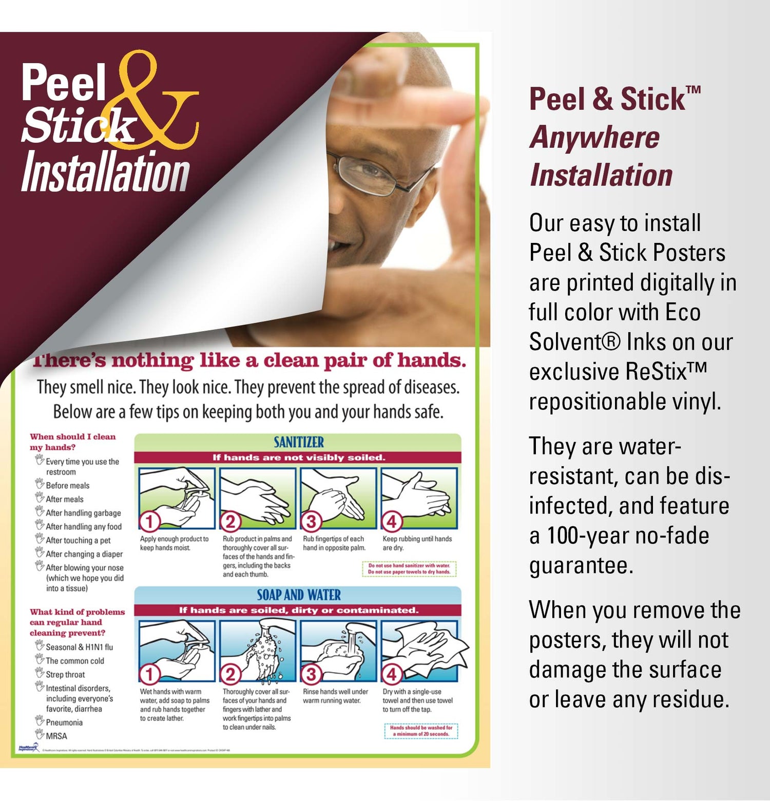 Our easy to install Peel & Stick Posters are printed digitally in full color with Eco Solvent® Inks on our exclusive ReStix™ repositionable vinyl. They are water-resistant, can be disinfected, and feature a 100-year no-fade guarantee. When you remove the posters, they will not damage the surface or leave any residue.